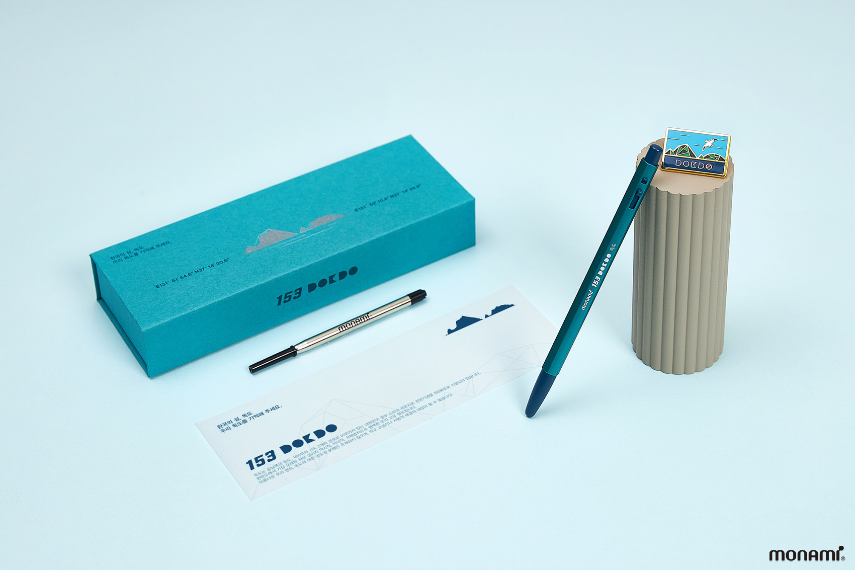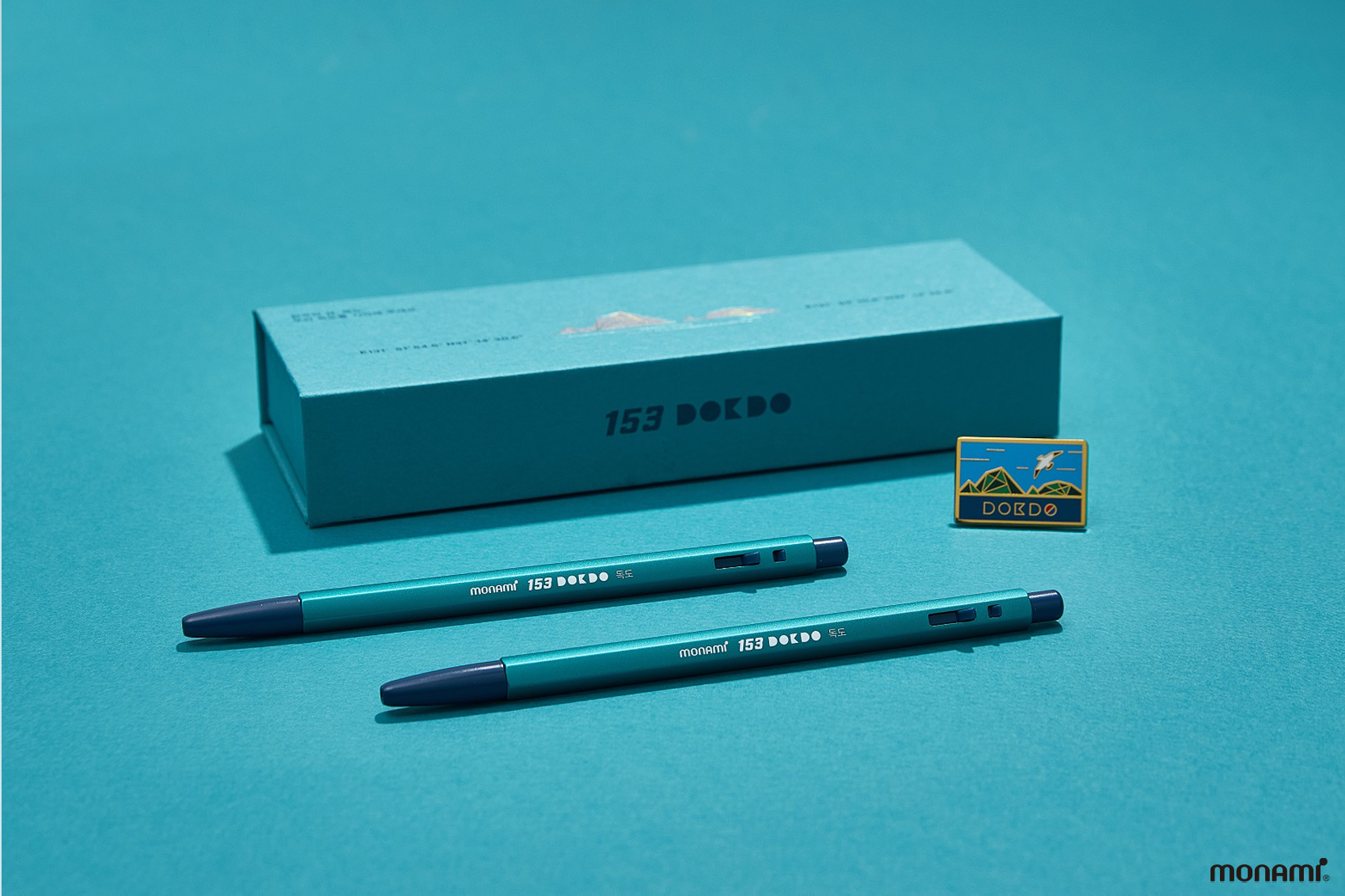 ’153 독도’는 독도와 동해를 연상시키는 에메랄드 컬러 바디에 진한 블루 톤의 금속 구금과 노크를 더한 것이 특징이다. 패키지는 0.7mm 필기선의 검정색 리필심 FX 4000을 장착한 153 고급 볼펜과 1.0mm 추가 리필심, 독도 배지, 트레이싱지, 지함으로 구성되어 소장 가치를 높였다. 현재 모나미 네이버 브랜드 스토어에서 ‘153 독도’를 20% 할인된 가격에 구매 가능하며, 제품 구매 시 타이니탄 립밤 증정 및 무료 각인 서비스도 제공한다.